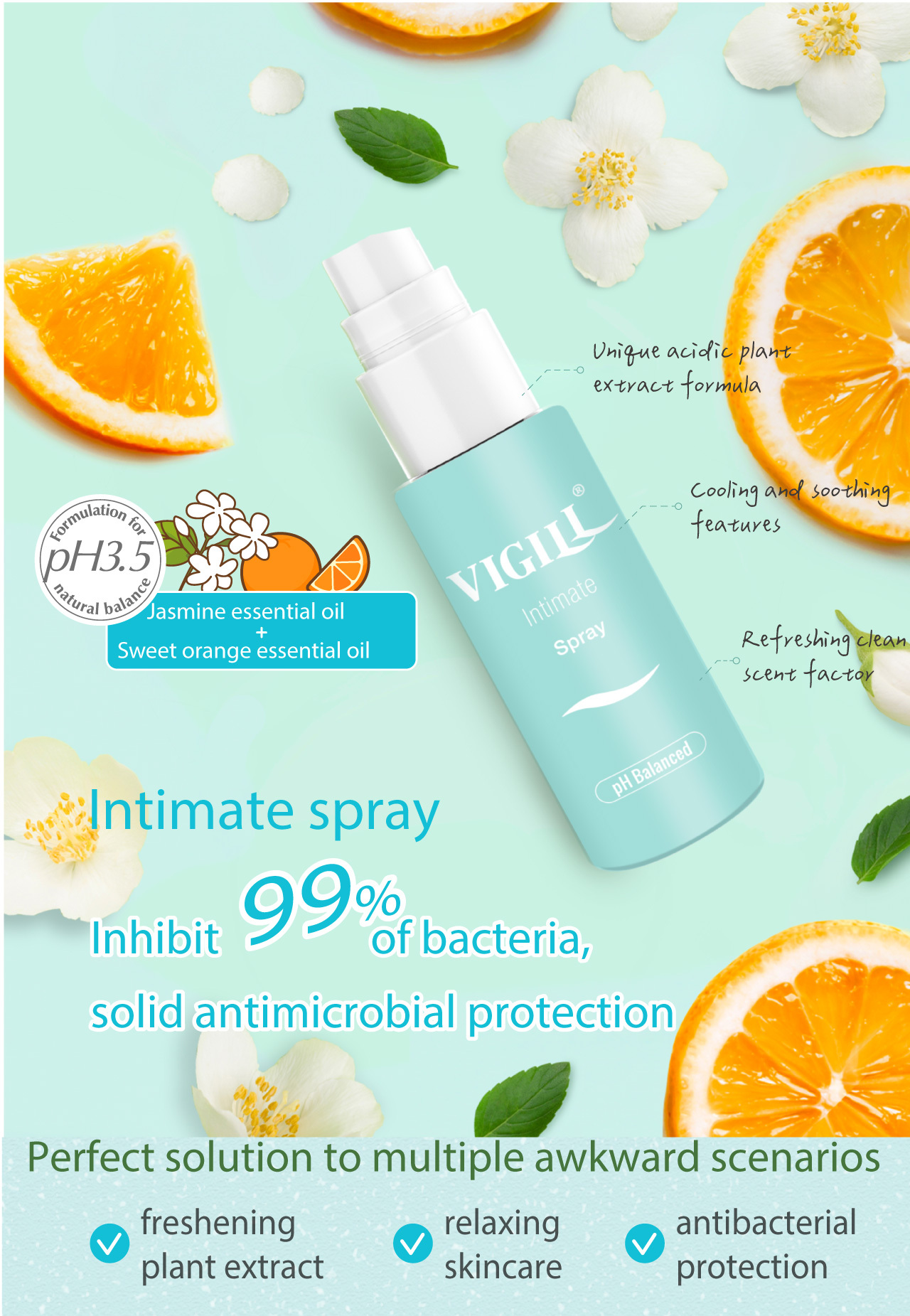 Ourlatest VIGILL spray, with its natural herbal formula, not only effectivelyremoves odor but also provides up to 99% antibacterial protection, moisturizingand soothing your intimate area to address these common issues.