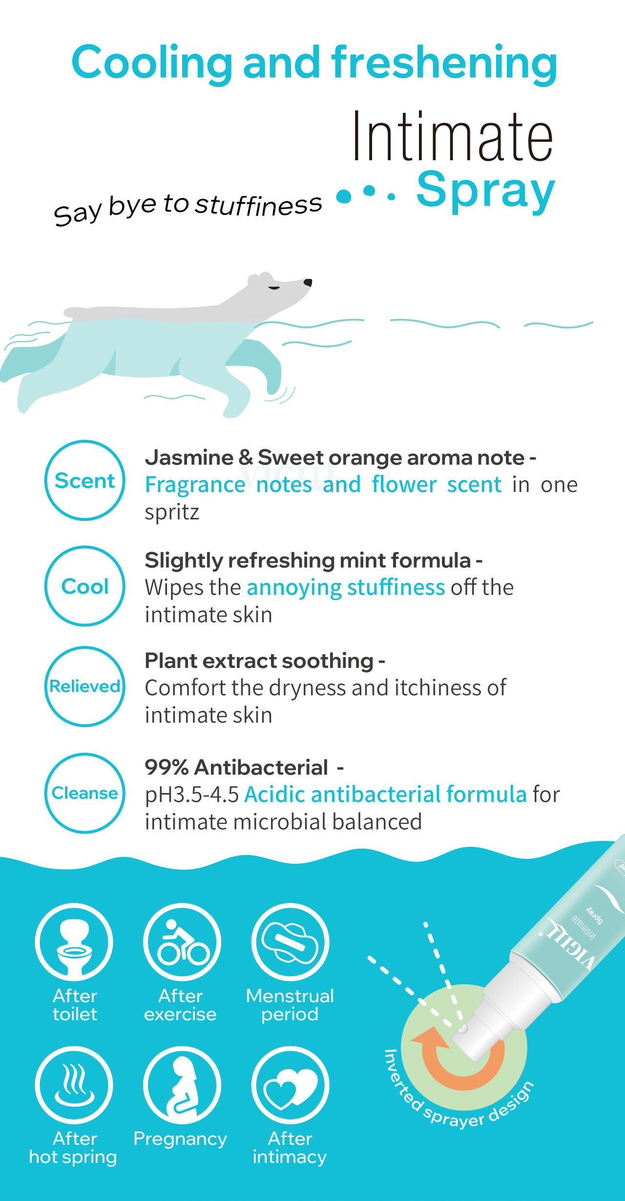 IntimateDeodorant & Cooling Spray: Offers solid antimicrobial protection, ensuring99% safety for your sensitive skin against bacteria.