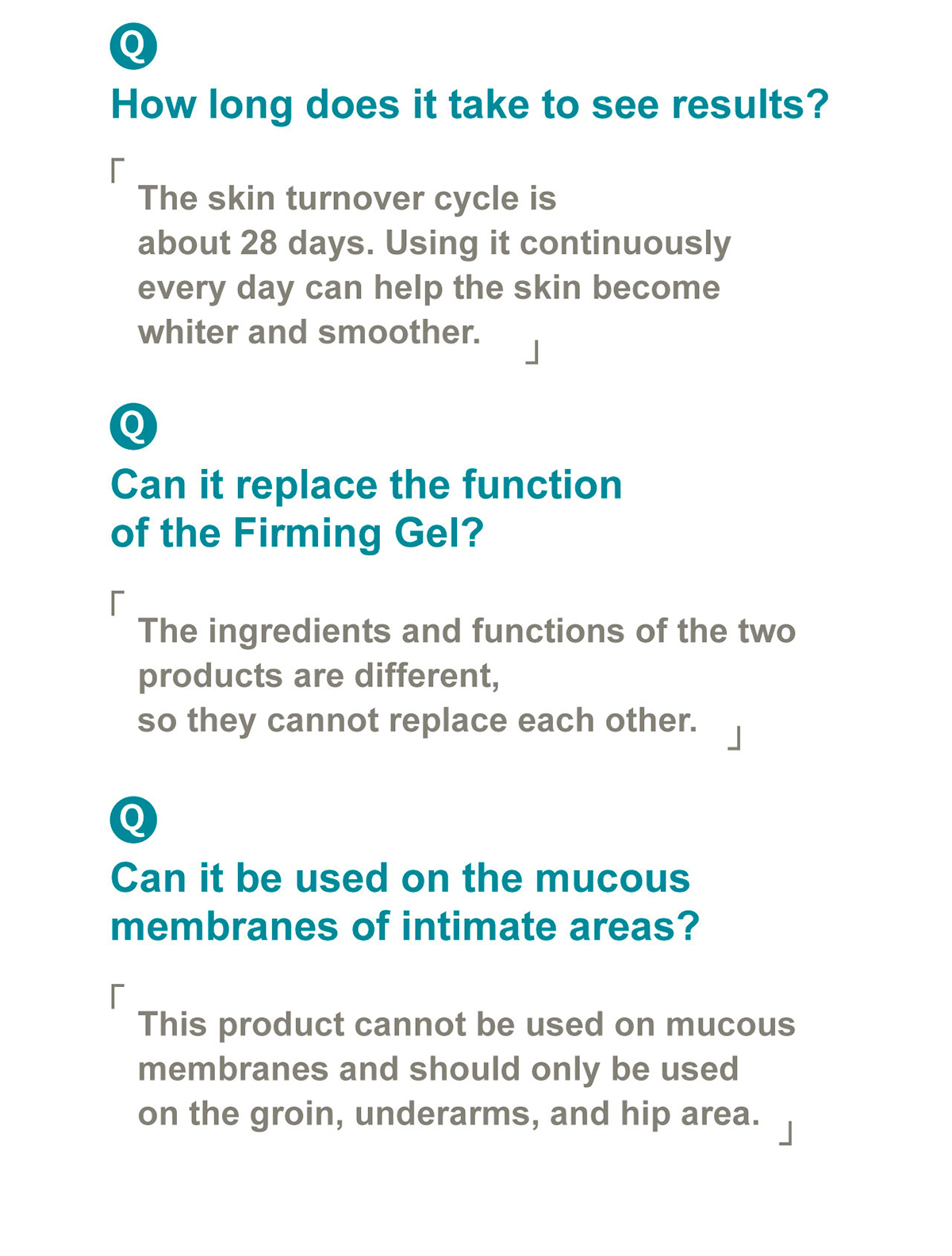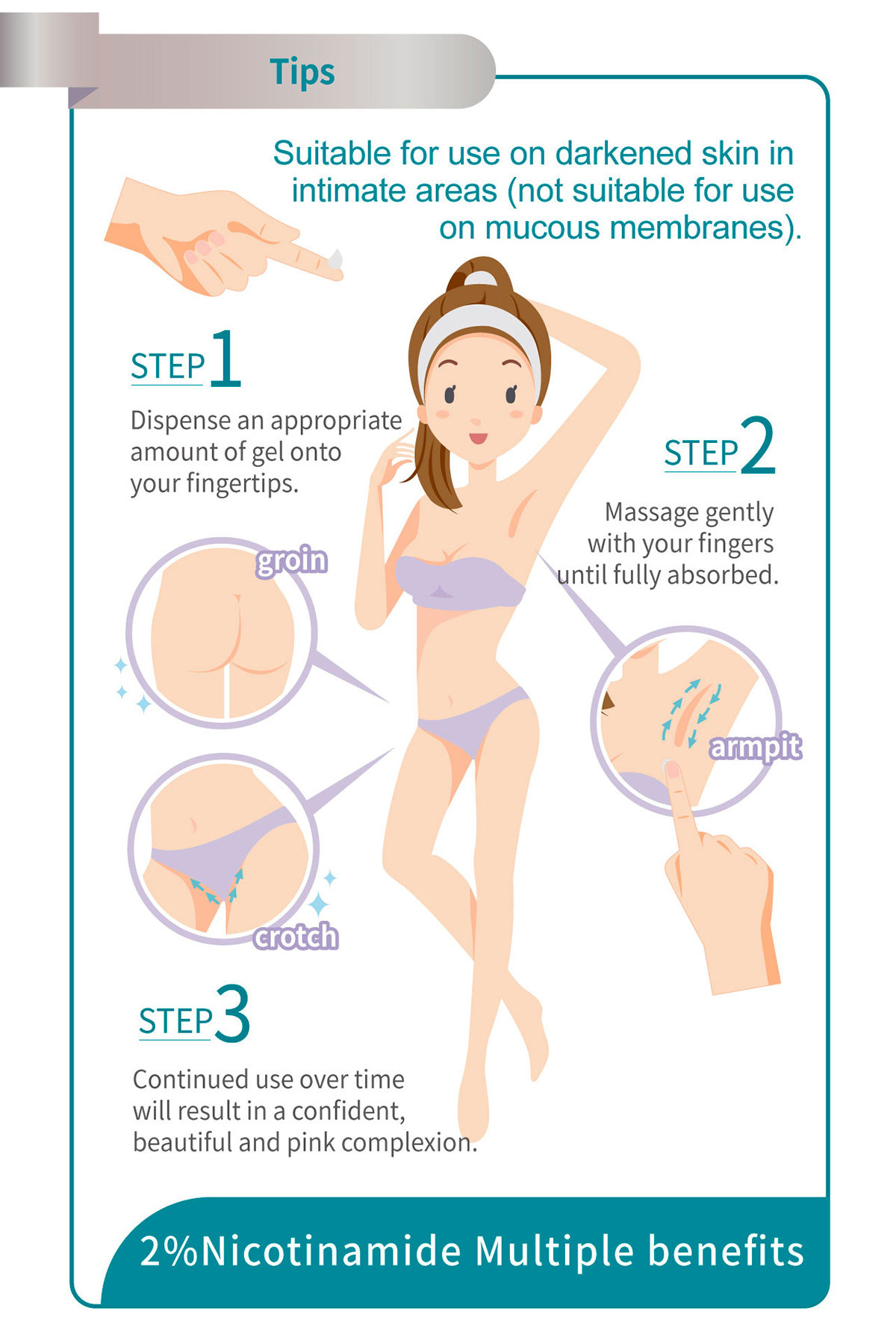 Upgraded formula with ultimatewater-like texture! Enriched with 2% Nicotinamide, a whitening ingredientapproved by the Health Department, it offers dual functions of skin whiteningand exfoliation suitable for non-sun exposure related dullness, such as bikiniarea, buttocks, armpits, knees, and elbows.