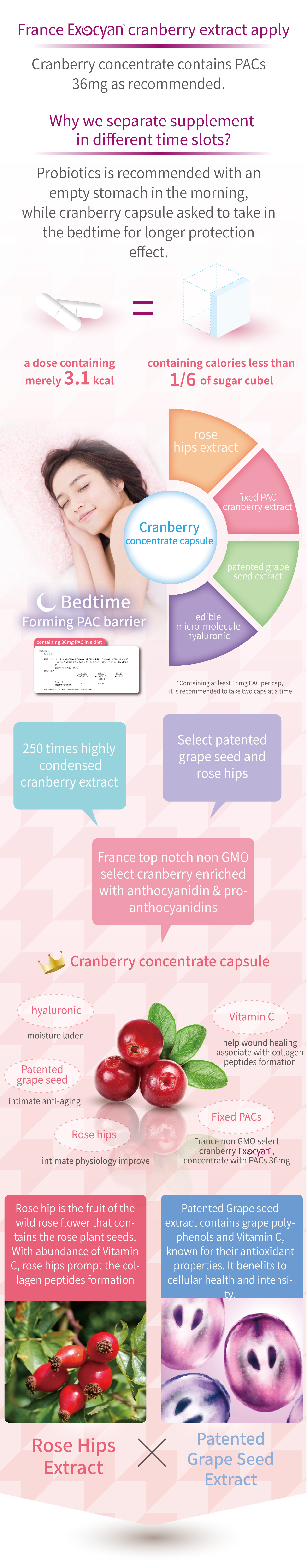 Each capsule deliversa potent dose of 36mg PAC cranberry extract, concentrated at 250 times fromFrench Exocyan™ cranberries. Enriched with hyaluronic acid and Vitamin C topromote collagen synthesis and skin healing, and infused with patented grapeseed and rosehip extracts to maintain youthful vitality. Experience beauty andwellness from within, every night!