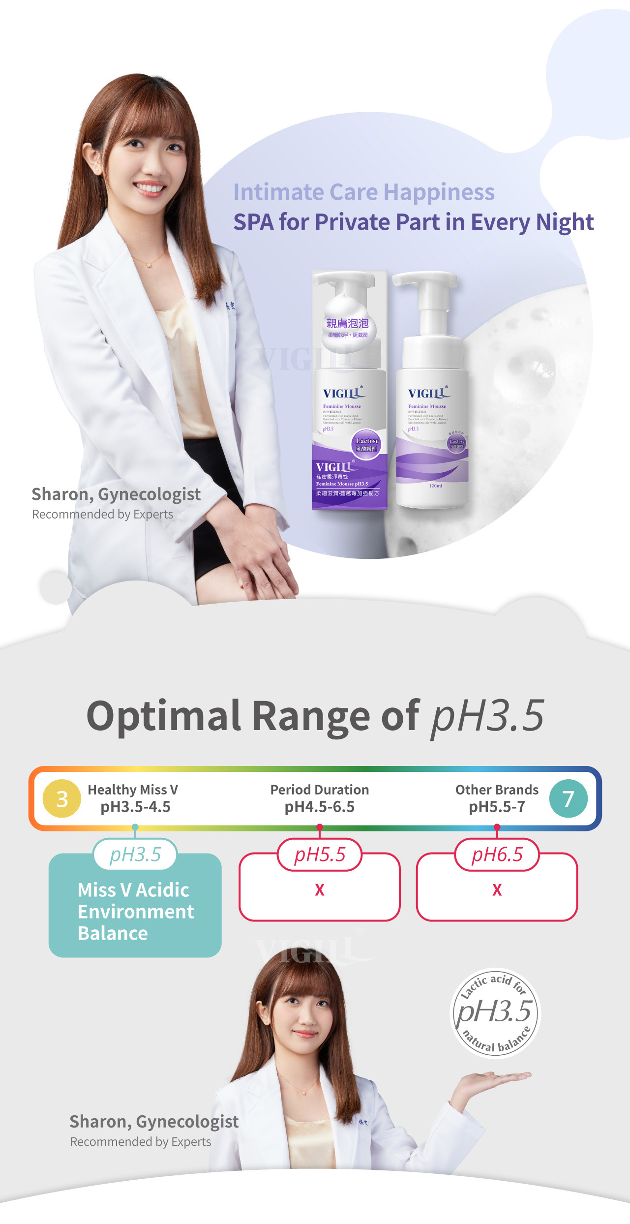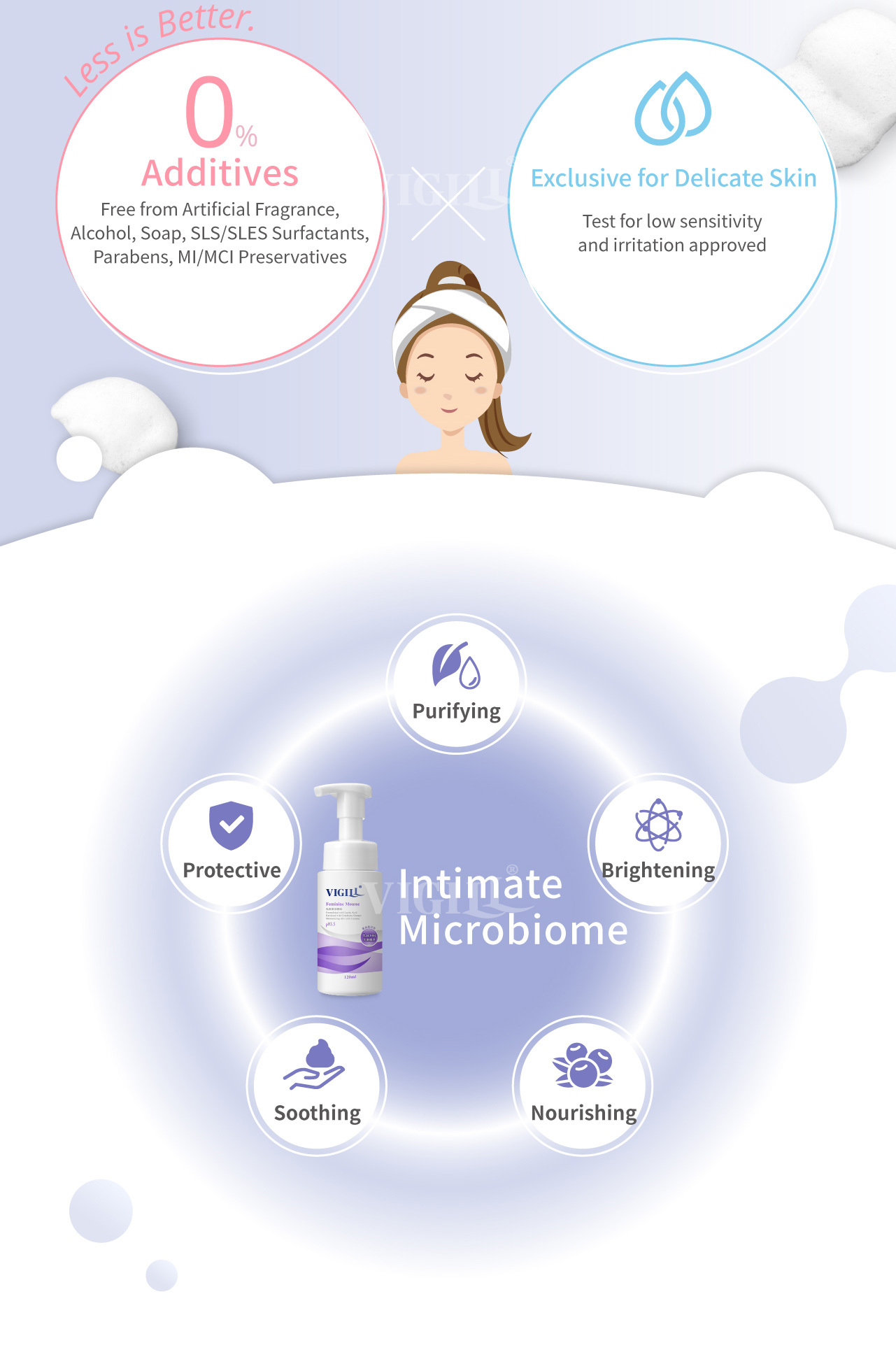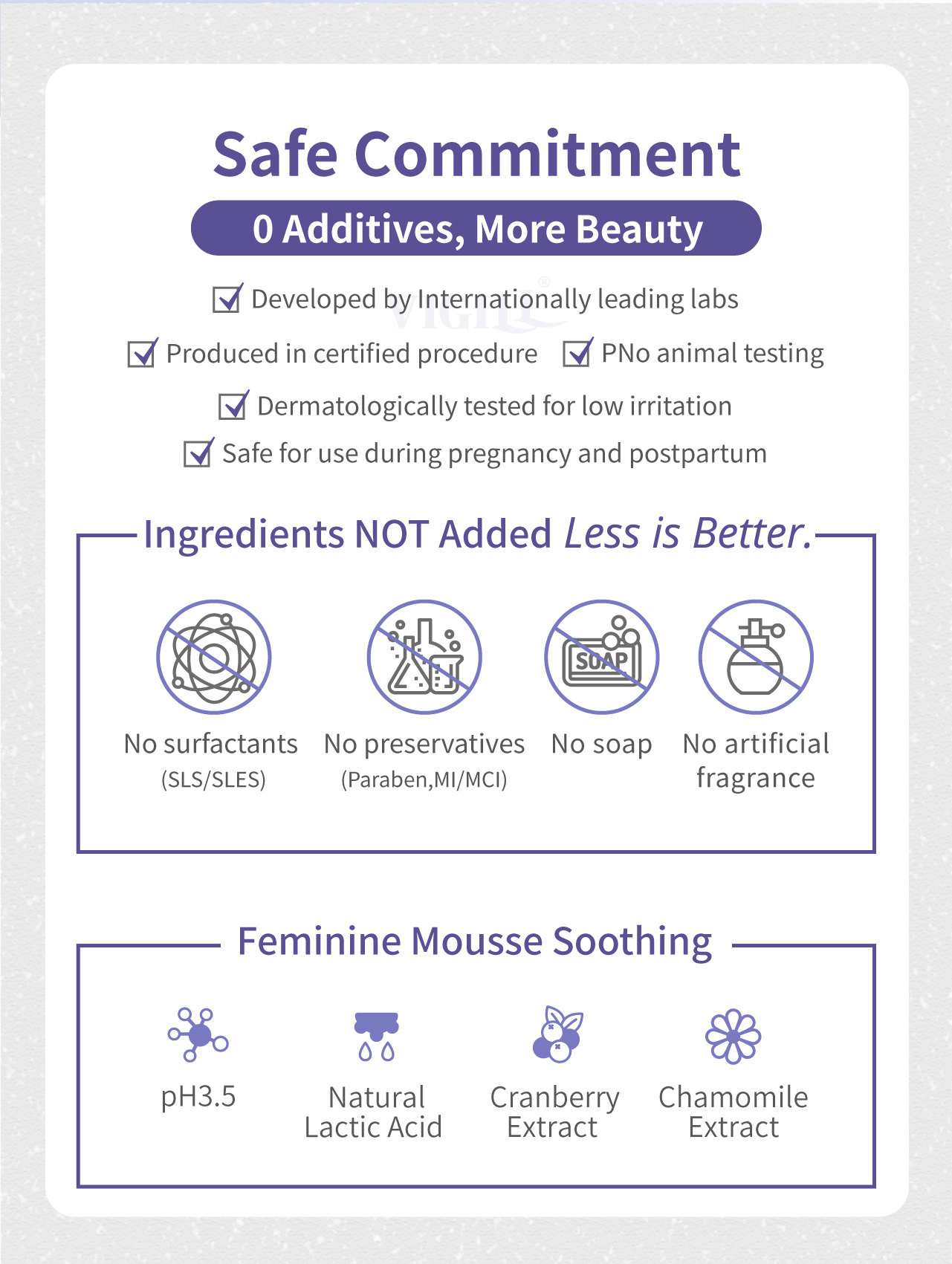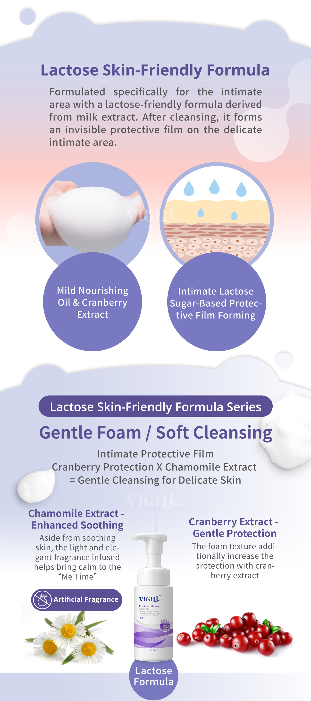 VIGILL Daily Feminine Mousse is a pH3.5 mild cleansing foam specially designed to maintain your intimate area's natural balance. Infused with lactose, cranberry extract, and chamomile, this daily mousse helps reduce itching,
