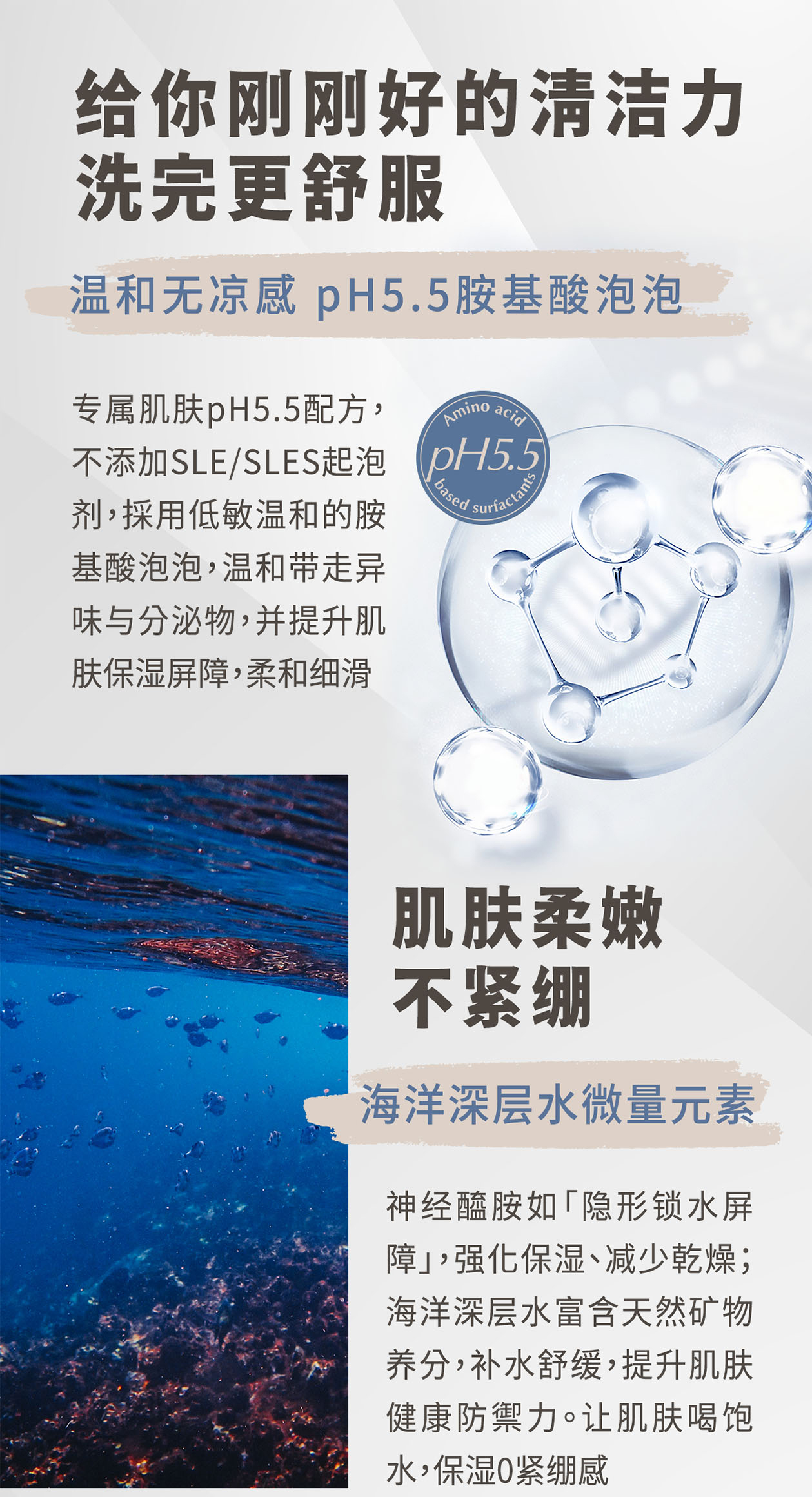 舒适亲肤- pH5.5平衡亲肤配方,搭配胺基酸系洁净成分的细致泡沫,清爽亲肤。