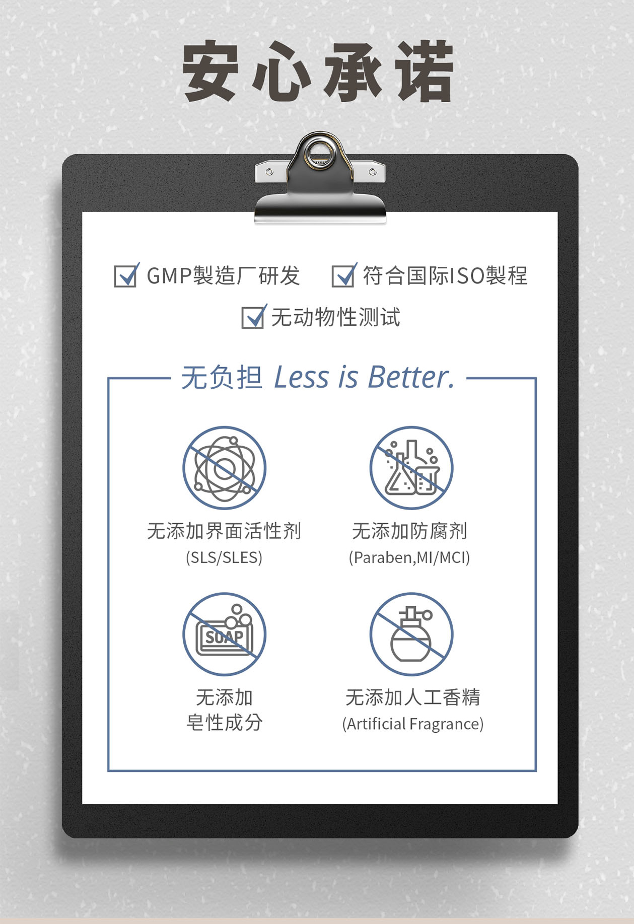 不含防腐剂、SLS、香皂及人工香料。适合每日使用。
