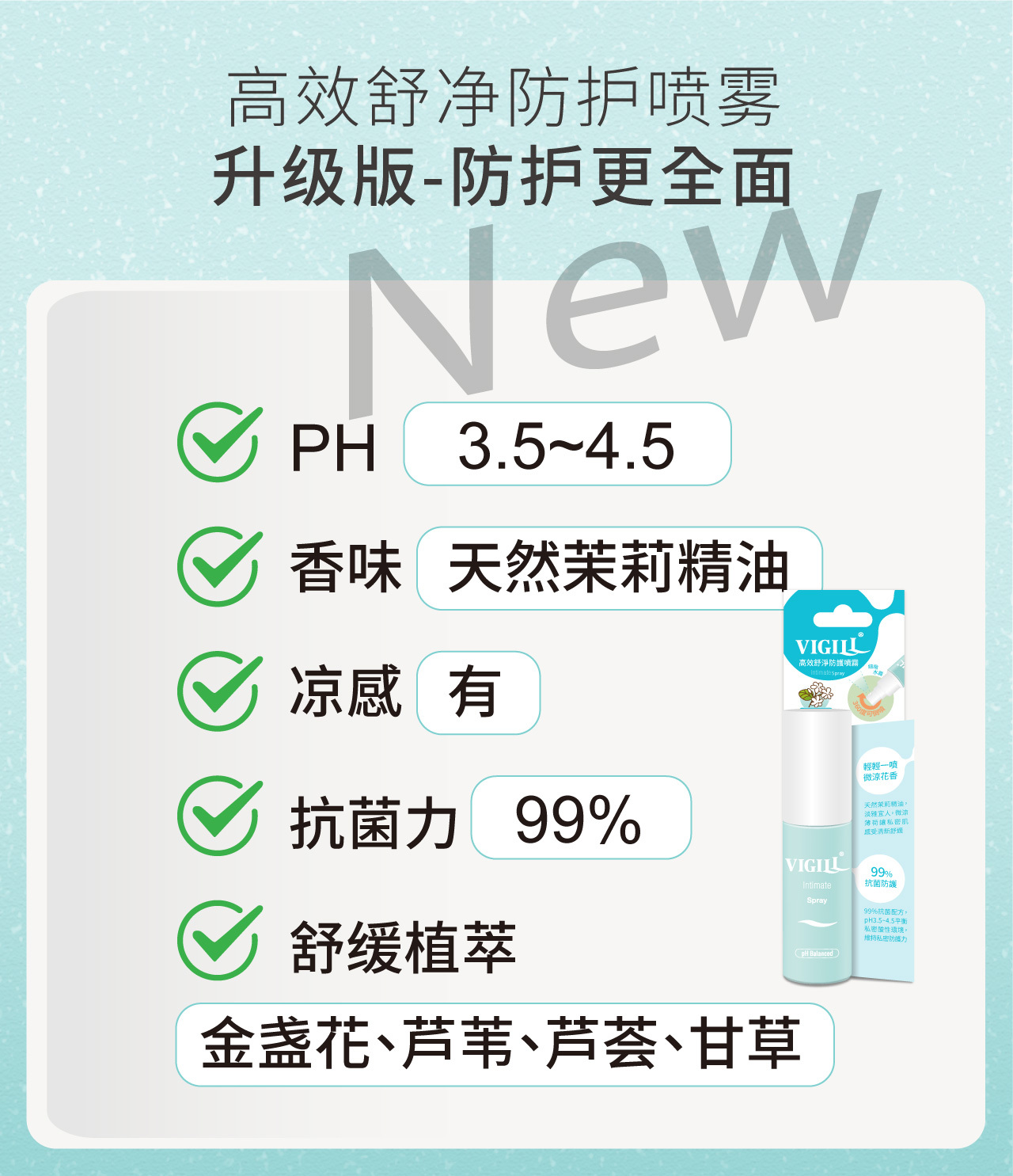 Ourlatest VIGILL spray, with its natural herbal formula, not only effectivelyremoves odor but also provides up to 99% antibacterial protection, moisturizingand soothing your intimate area to address these common issues.