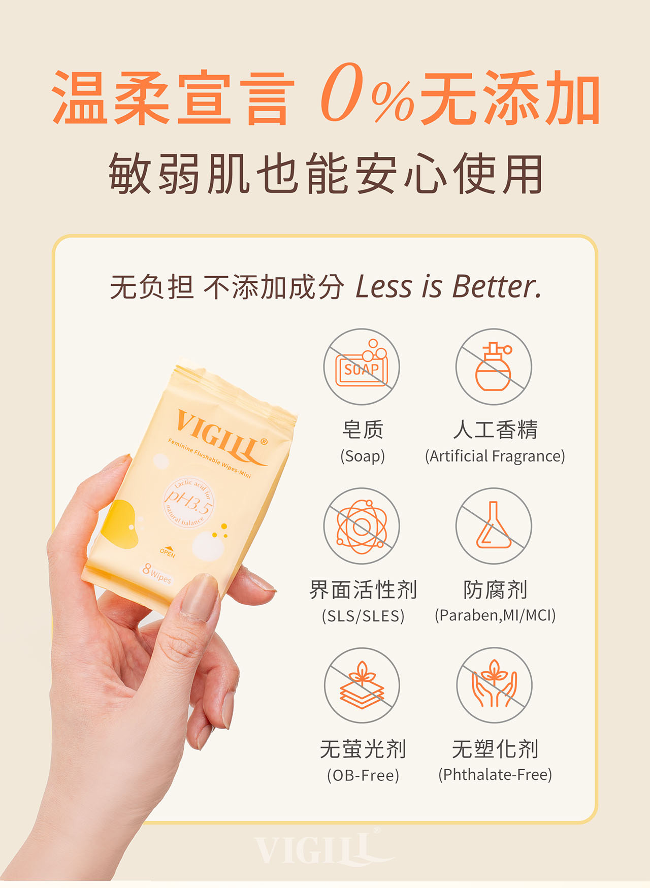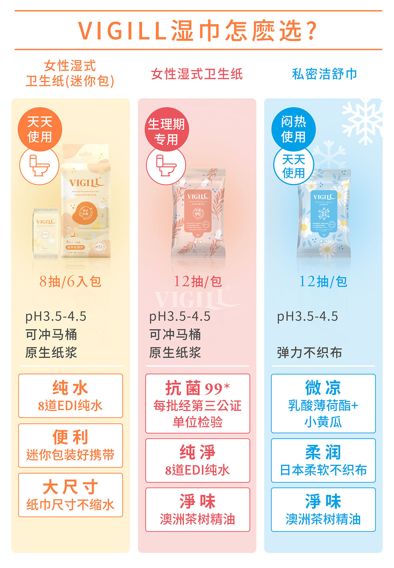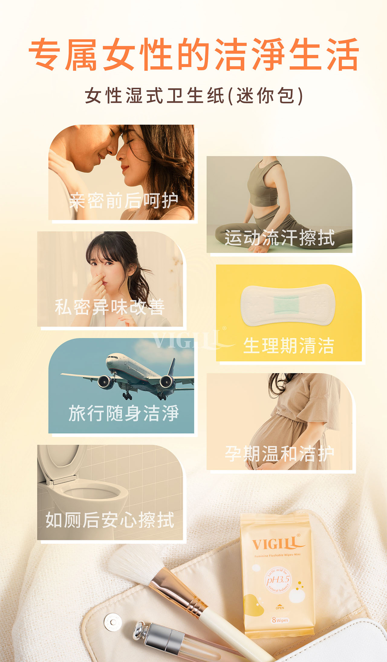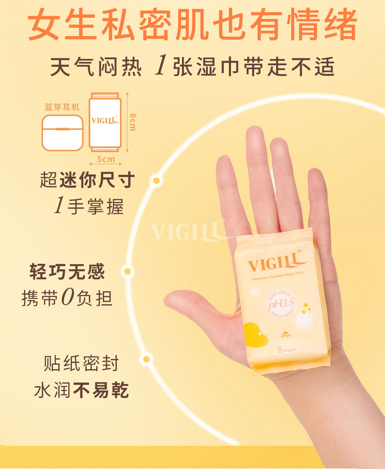 VIGILL 女性湿纸巾专为女性私密清洁而设计,温和呵护、不刺激,是日常如厕后、闷热流汗、外出旅行的理想选择。