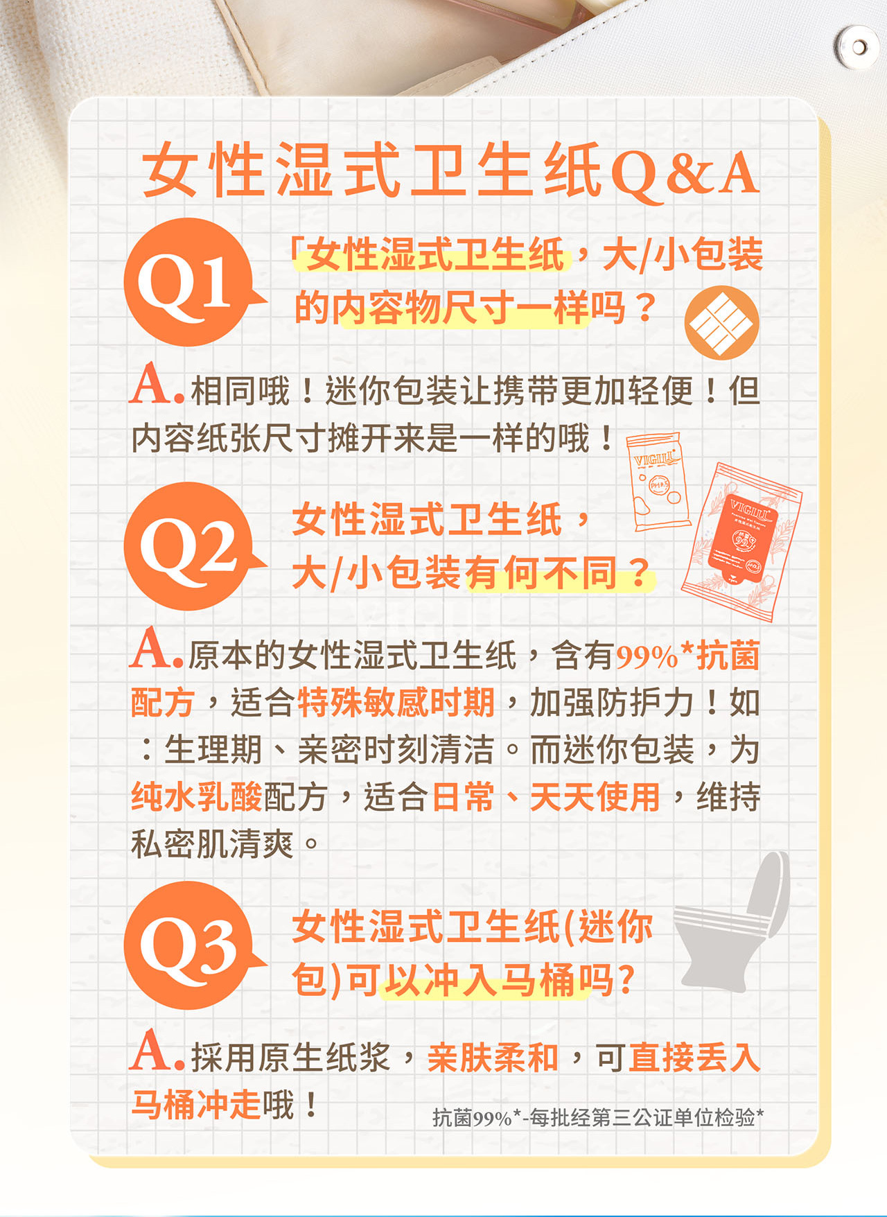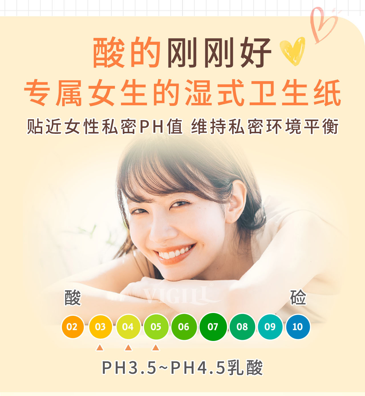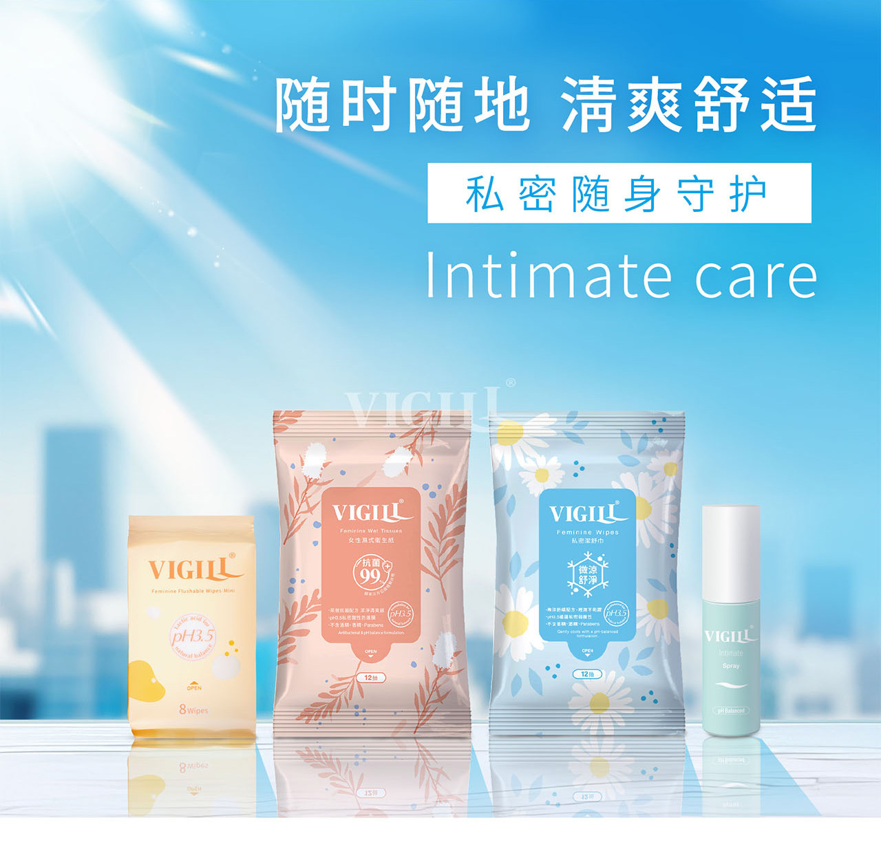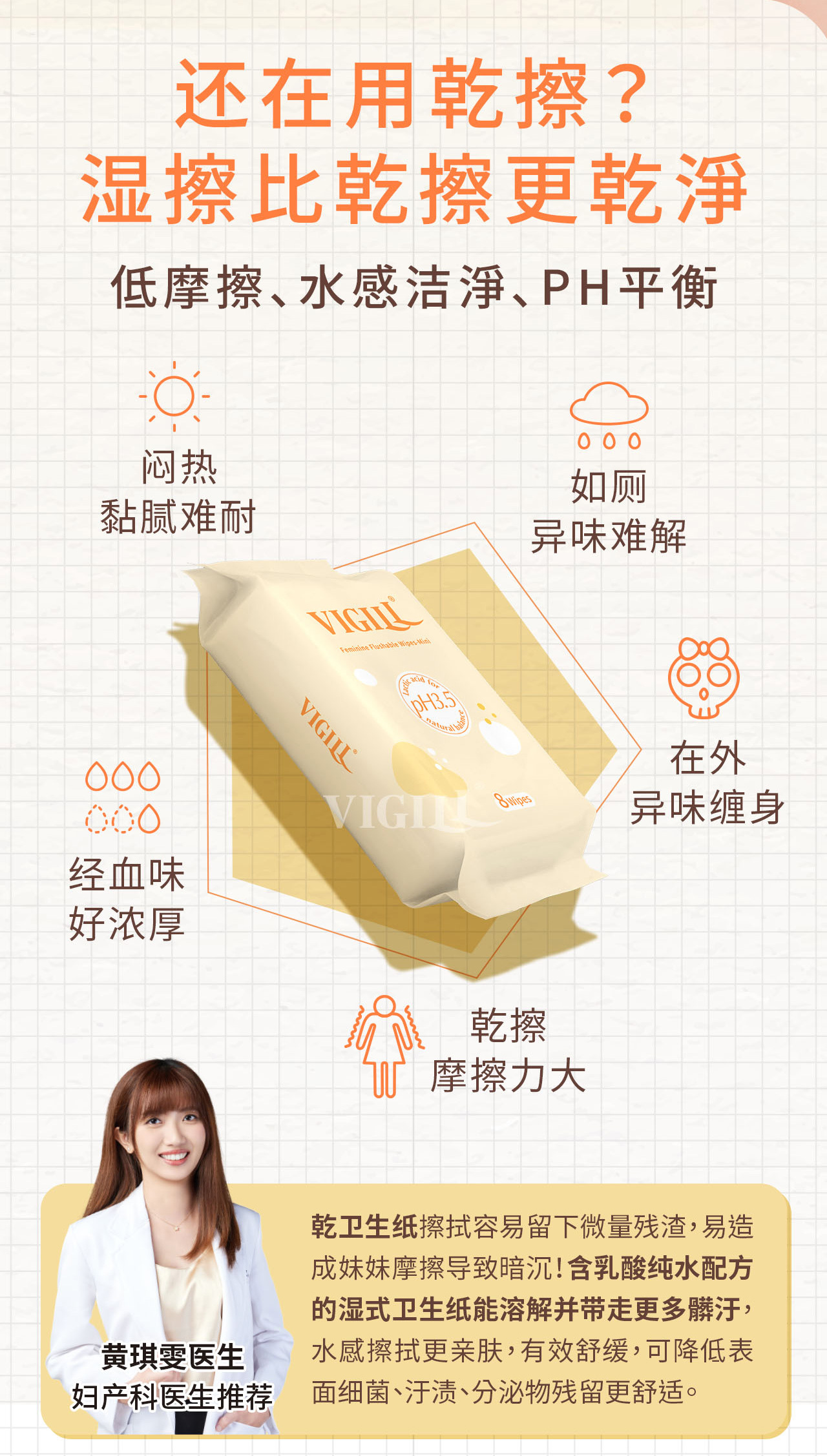 VIGILL 女性湿纸巾专为女性私密清洁而设计,温和呵护、不刺激,是日常如厕后、闷热流汗、外出旅行的理想选择。