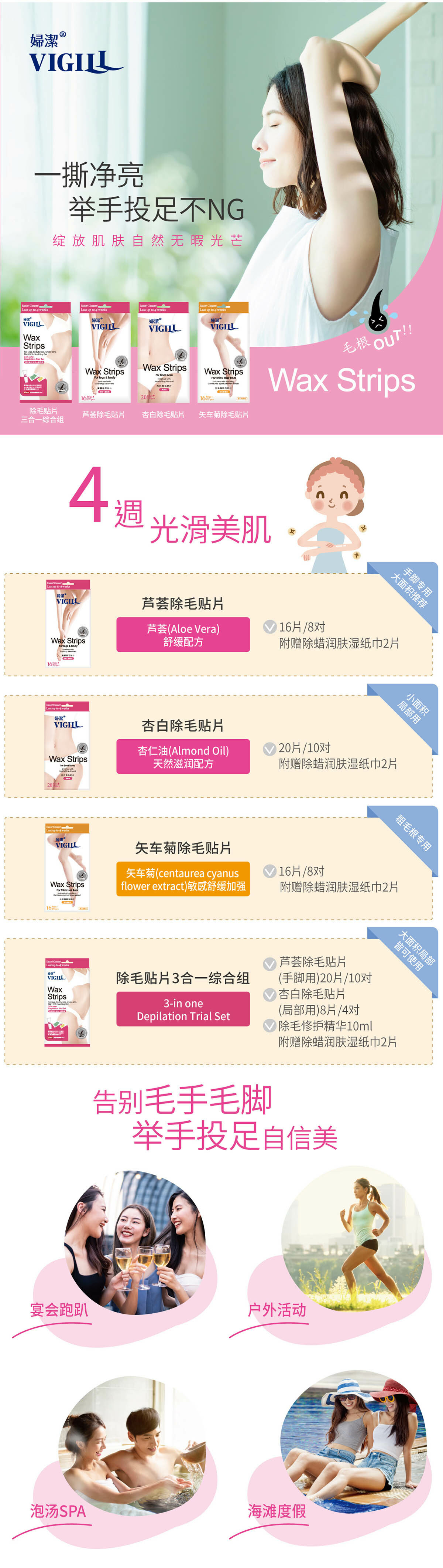 可使用于手、脚需除毛位置,特别添加芦荟(Aloe Vera) 舒缓配方,除毛同时能呵护脆弱皮肤,提供肌肤最佳保护力与滋润舒缓效果除毛贴片能温和深入毛囊,将毛发连根拔根,最久可维持4周光滑肌肤,长期使用,毛发也会变得越少越细